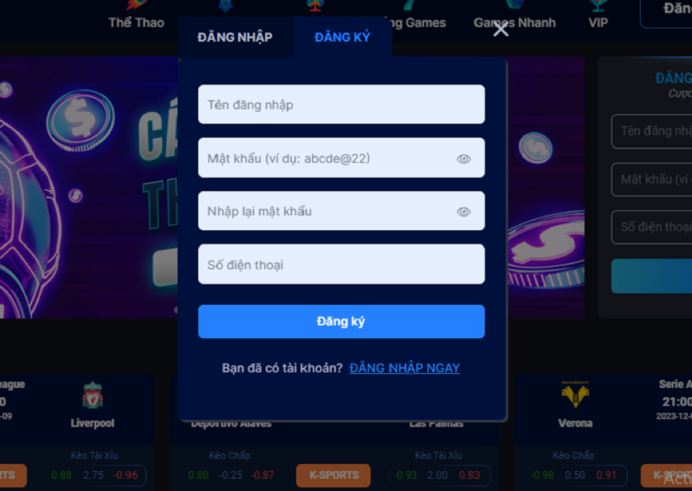 Nếu đang còn ở lại trang chủ, anh em chỉ việc nhấp vào mục “ĐĂNG NHẬP” màu xanh trên giao diện chính. Sau đó điền tên + mật khẩu đăng nhập rồi nhấn lại “ĐĂNG NHẬP” là xong.
